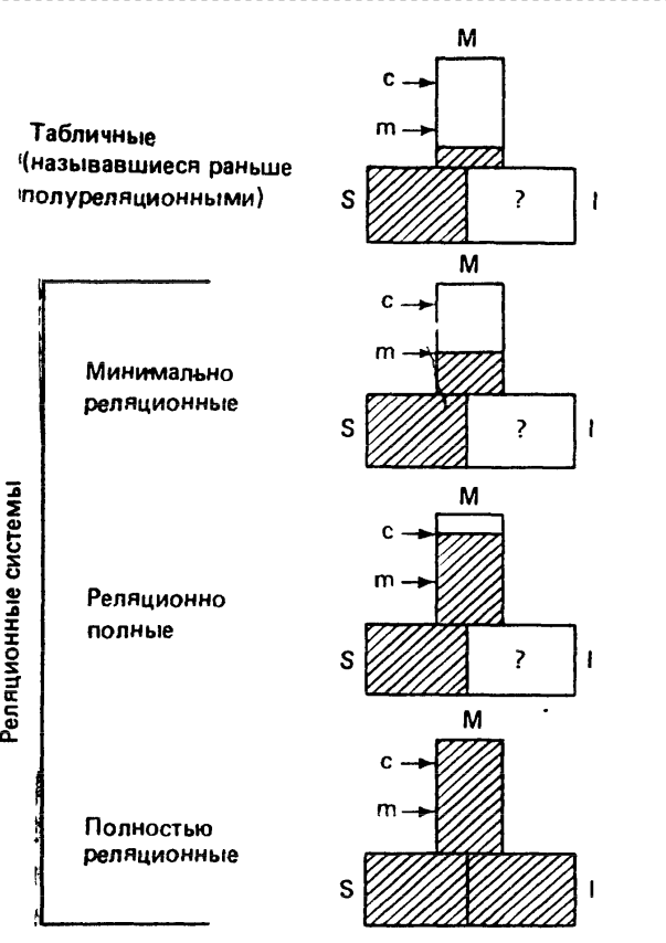 На рис. 1 продемонстрированы различия между разными классами реляционных и табличных систем. Для каждого класса величина заштрихованной части прямоугольника показывает, насколько в базах данных из этого класса выполняются структурные требования, предъявляемые к реляционной модели данных. То же самое относится и к прямоугольнику и требованиям к обрабатывающей части базы данных, и к прямоугольнику и требованиям к части базы данных, касающейся правил целостности.